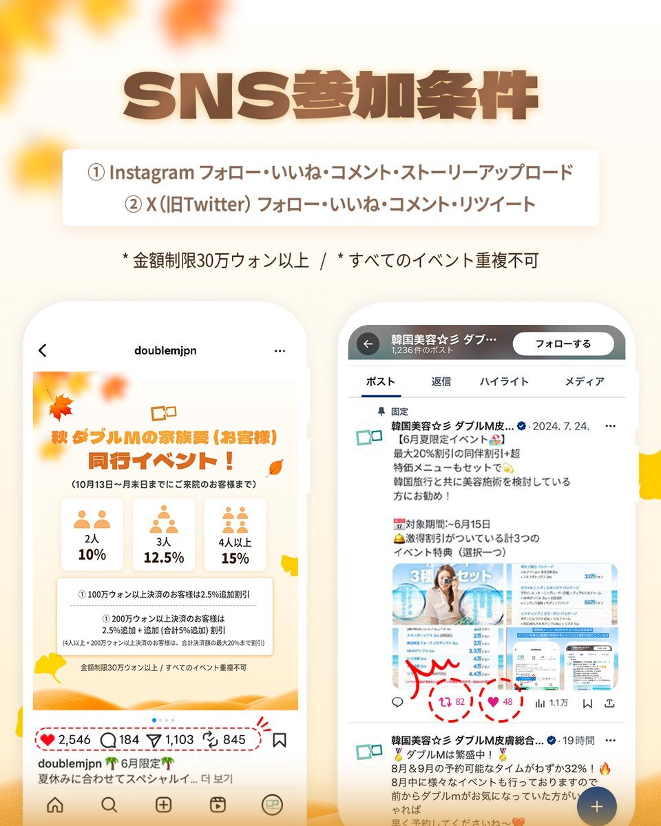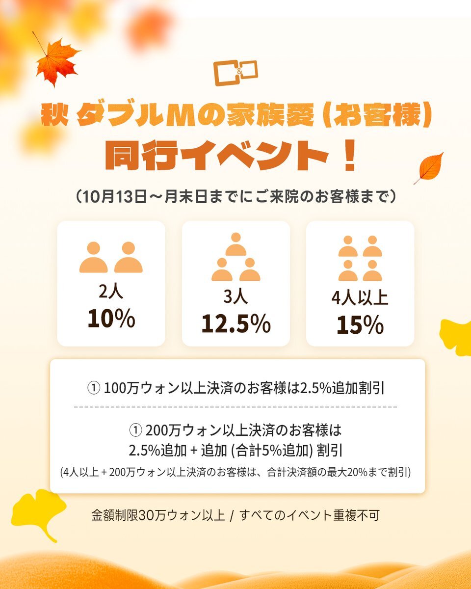 🍁秋の同行イベント開催🍁 10月13日〜月末までにご来院のお客様限定✨ 2名→10% 3名→12.5% 4名以上→15%割引✨ 💳 100万ウォン以上+2.5% 💳 200万ウォン以上+5% 👉 最大20%割引まで! #韓国美容イベント #同行イベント #韓国美容外科 #韓国美容クリニック #秋イベント #韓国美容旅 #江南皮膚科 pic.x.com/nSD1722Ual