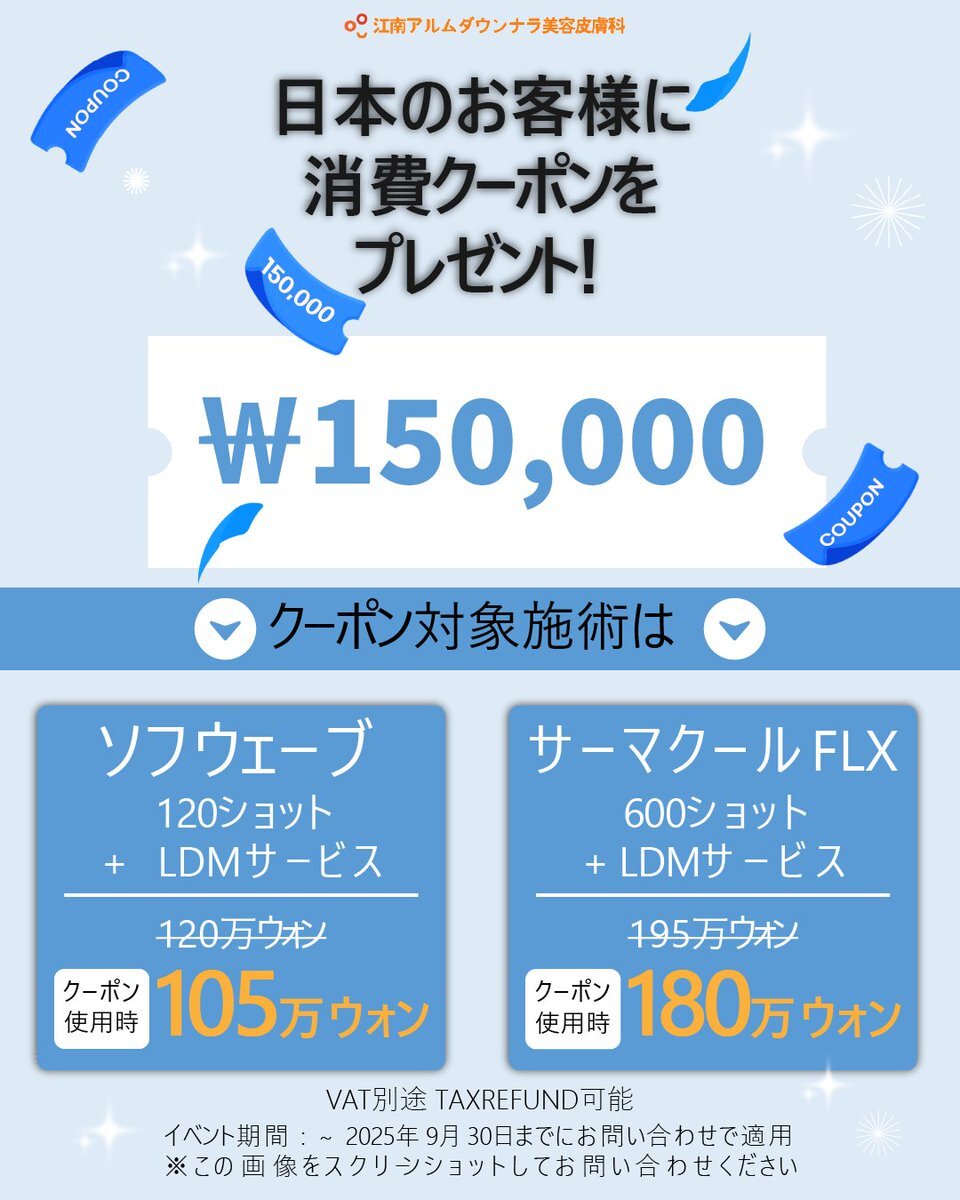 先日、韓国では全国民を対象とした 民生回復消費クーポンの配布が始まり 大きな恩恵を受けています🪄 そこで #江南アルムダウンナラ美容皮膚科 では 当院にご来院の日本のお客様もお得に施術を受けられるよう 特別なイベントを準備しました🎁 画像にはないお得なイベントも?! 詳細は👇