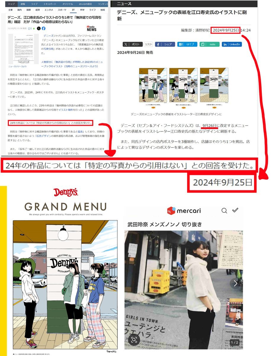 『23年の作品「権利関係の許諾の必要性についての認識なく、人物部分は商業雑誌からの引用でイラスト制作」24年の作品「特定の写真からの引用はない」』/#デニーズ、#江口寿史 氏のイラストのうち1件で「無許諾での写真引用」確認 だが「作品への敬意は変わらない」 ITmedia itmedia.co.jp/news/articles/…
