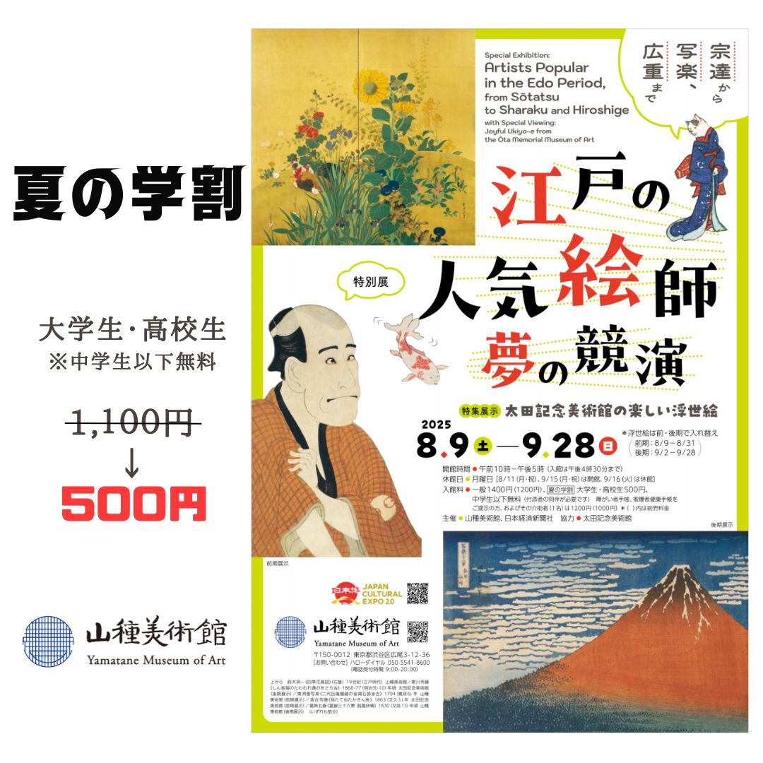 #江戸の人気絵師展 では会期中、夏の学割を実施しています! 大学生・高校生1100円→500円! ※中学生以下無料(付添者の同伴が必要です) 9月の連休のお出かけは、ぜひ #山種美術館 にお越しください! pic.x.com/9Axahc4rDu