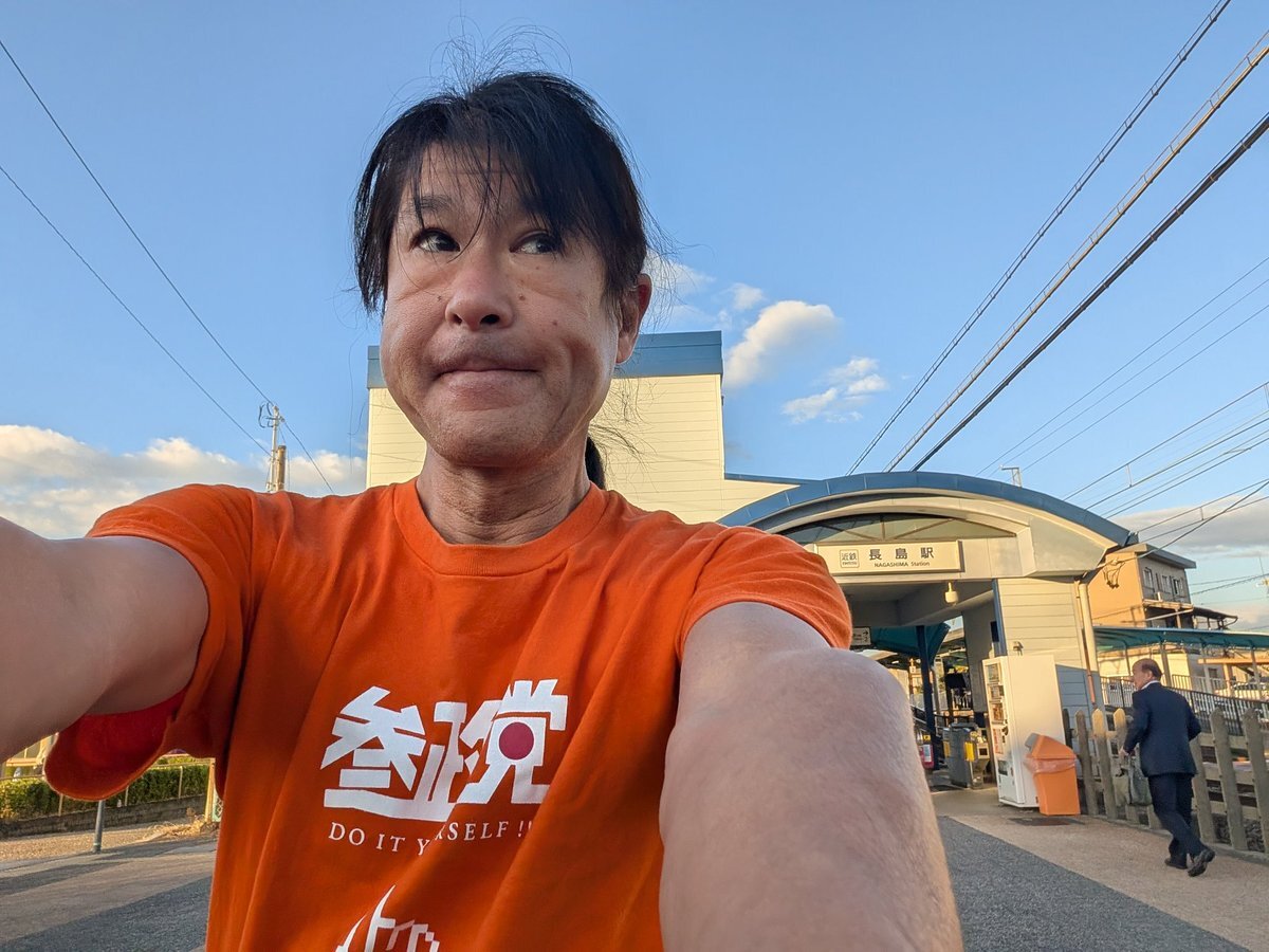 2025-10-28🇯🇵 本日の5.5キロ辻走りからの #桑名駅 駅立ち 今から5.5キロ辻走りで帰ります🫡 橙色のジャケット、🇺🇸に置いてあるんだよなぁ🤔 まだ半袖でも大丈夫ではあるけど😁 #参政党は仲間がたくさんいる #参政党支持者と繋がりたい
