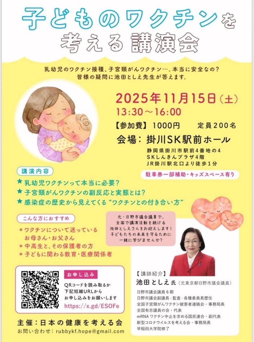 日本の健康を考える会です‼️ 11.15(土)に、静岡県掛川市で池田としえ先生の講演会開催です‼️ 貴重な講演会です‼️ 是非、お越し下さい‼️ お申込みはコチラ👇️ x.gd/ESOFe 街宣も予定してます‼️詳細はまたご確認下さい‼️😊 #池田としえ #講演会 instagram.com/p/DOhRwgNk1L7/…