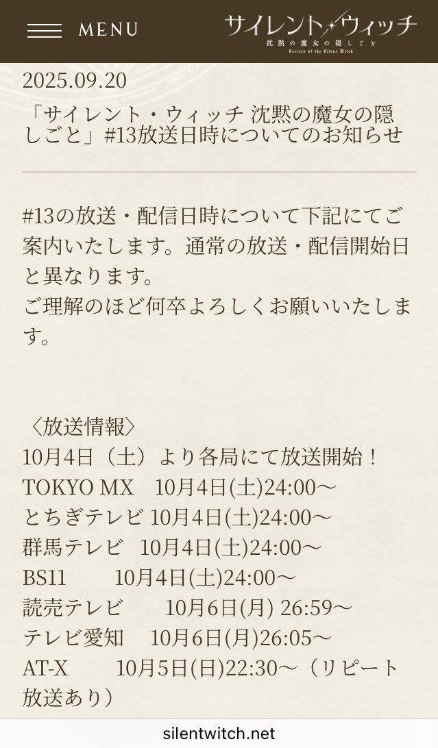 #サイレントウィッチ が #沈黙の魔女の隠しごと が あと2話で終わっちゃうううう #モニカ あああああ 寂しいよー(><) あと放送予定が 自分が観てるTOKYO MXだと 今日12話なのだけど… 最終話(13話)の放送が通常と違うらしいので絶対間違いないように気をつけよう٩( 'ω' )و pic.x.com/p3wDRIvnzB