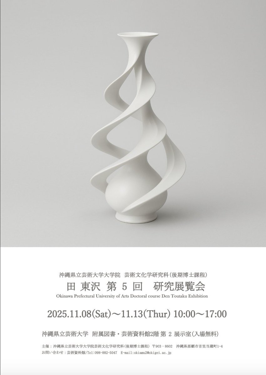 2025年11月8日(土)~11月13日(木) 田東沢 第5回 研究展覧会 会場 :附属図書・芸術資料館2階(第2展示室) 時間 :午前10時~午後5時 入場は無料。 #沖縄県立芸術大学 #芸術文化学研究科 pic.x.com/KkLavx2j6D