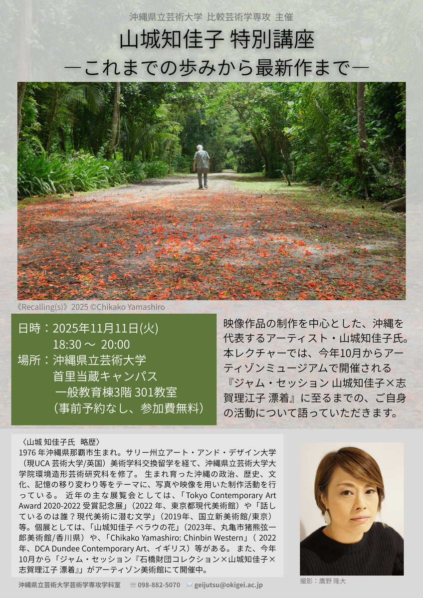 【特別講座のお知らせ】 〈山城知佳子 特別講座 —これまでの歩みから最新作まで—〉 主催:比較芸術学専攻 講師:山城 知佳子 日時:2025年11月11日(火) 18:30 ~ 20:00 場所:沖縄県立芸術大学 首里当蔵キャンパス 一般教育棟3階 301教室 ※事前予約なし、参加費無料 #沖縄県立芸術大学 #山城知佳子 pic.x.com/PsOHdgBmP6