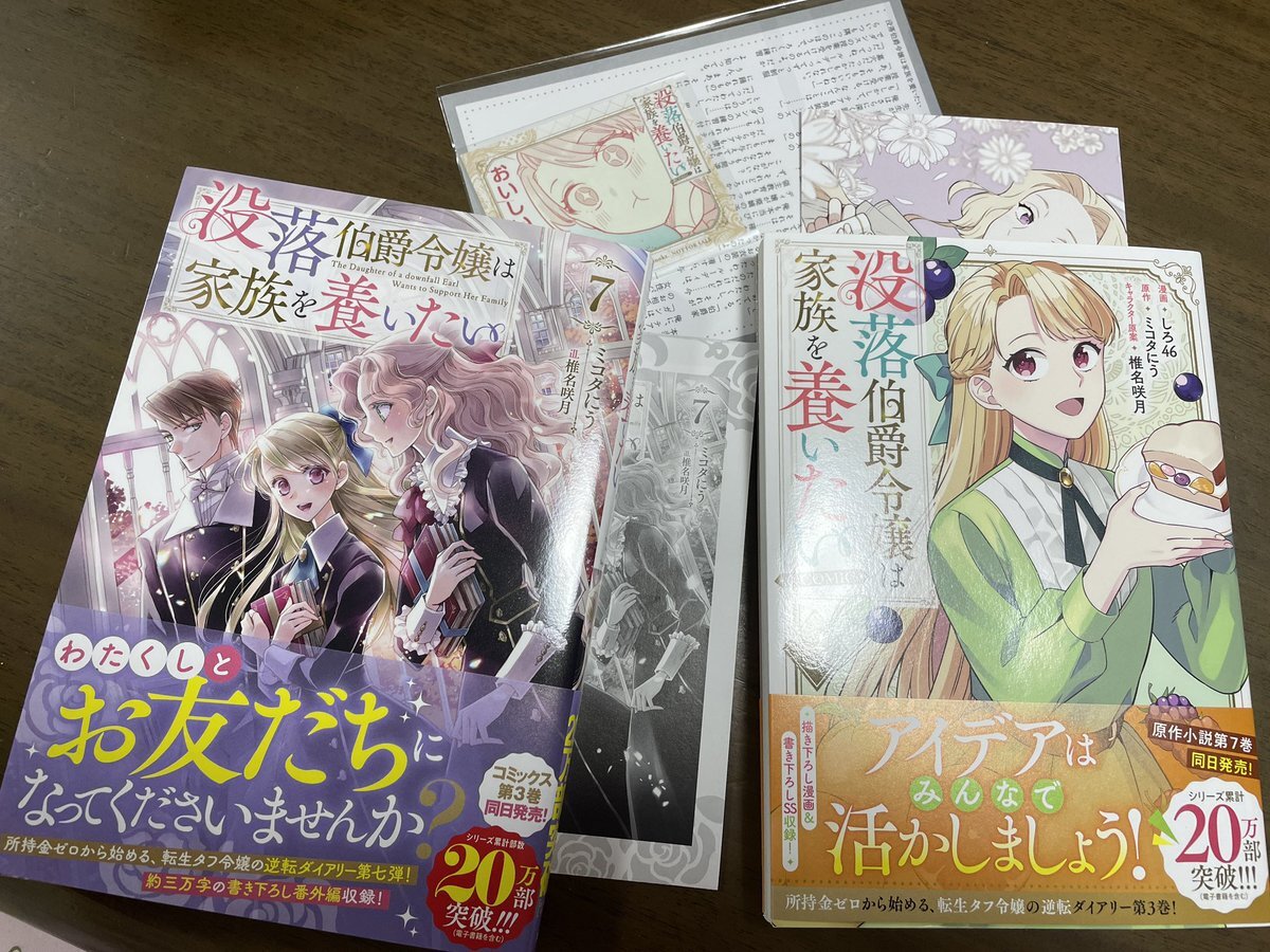✨本日発売✨ 🎉ノベル第7巻&コミックス第3巻🎉 #没落伯爵令嬢は家族を養いたい 転生タフ令嬢の逆転ダイアリー! 著 #ミコタにう イラスト #椎名咲月 漫画 #しろ46 ▼TOブックスオンラインストア同時購入セットは 【ショートショート付きイラストペーパー(1枚)】 【ミニステッカー(1枚)】 pic.x.com/16GYhhlwfJ