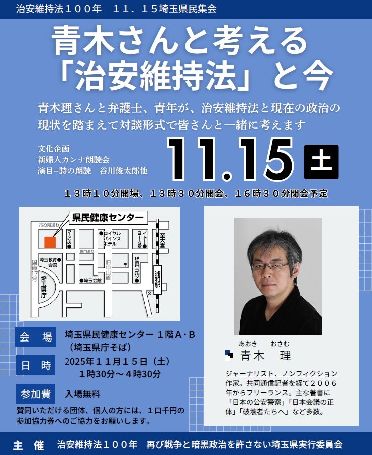 #治安維持法100年 #埼玉県民集会 日時 11.15(土)13:30~16:30 会場 埼玉県民センター 参加費 無料 『青木さんと考える「治安維持法」と今』 pic.x.com/EeYuS11cH1