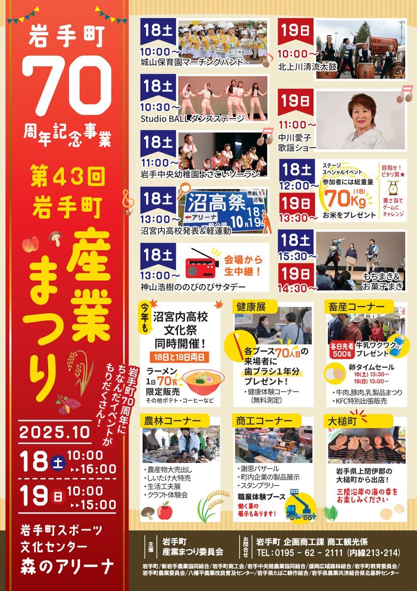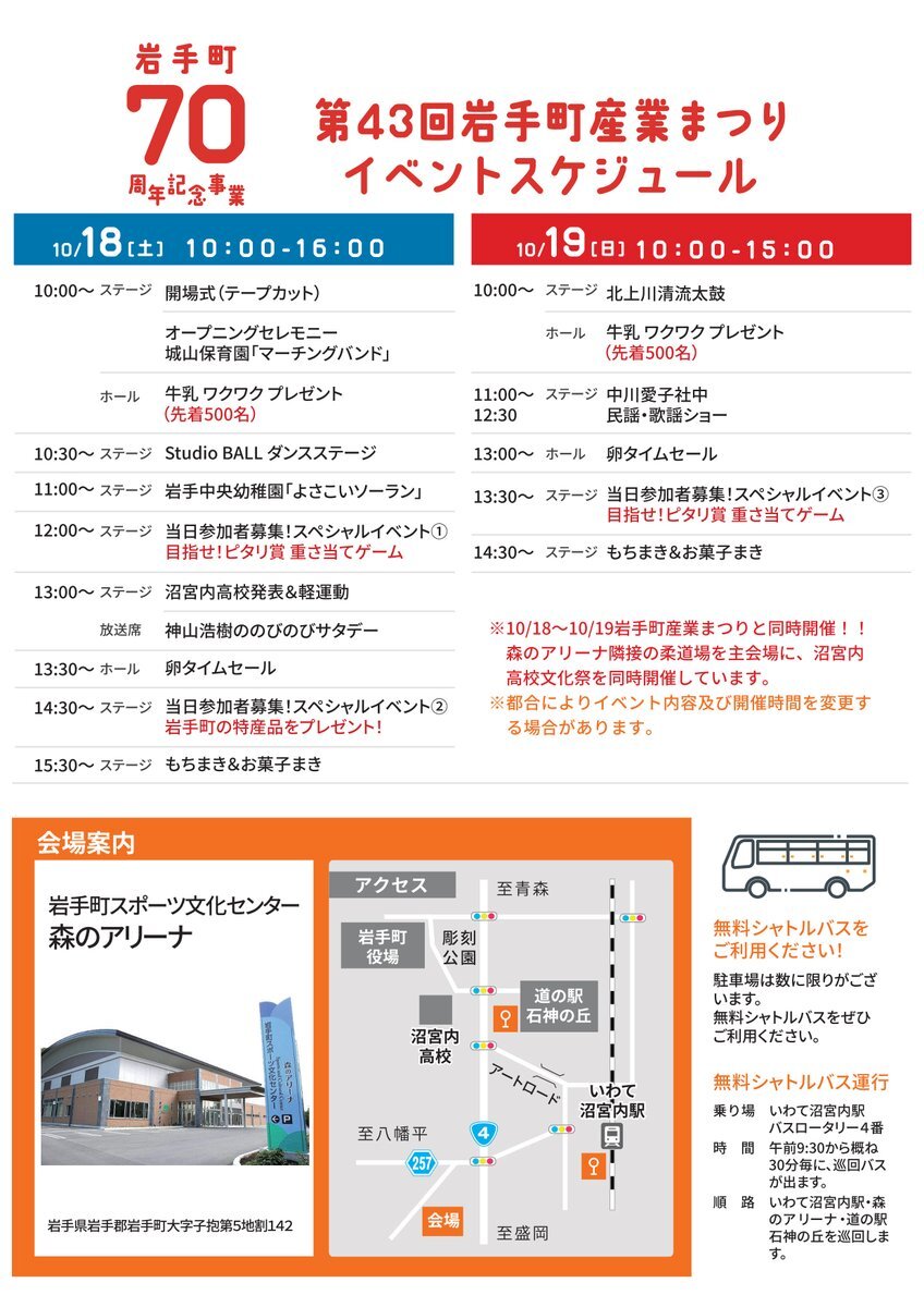 ★第43回岩手町産業まつり★ 岩手町70周年記念事業 第43回岩手町産業まつりが2日間開催されます! 沼宮内高校の文化祭も同時開催です。 楽しいイベントや岩手町の特産品がたくさんありますので、ぜひ足を運びください! #岩手町 #産業まつり #沼宮内高校 #文化祭 #いわてまち #牛乳プレゼント pic.x.com/WIN8LFae1r
