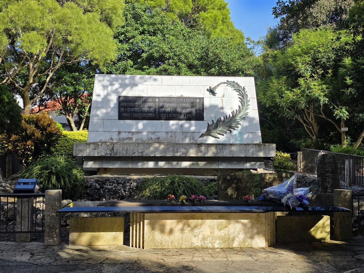 やっと沖縄の戦跡地で祈念できた。 何度か沖縄に来ているが初めてなんだよ。広島・長崎・知覧・パリ、そして沖縄。 出口からすぐのベンチに猫🐈‍⬛ちゃんが気持ち良さげに寝てた。 バナナはバス待ちしてたら、近所のおじぃがやって来て立ち話したときにいただいた #沼津サポ沖縄遠征 #沼津サポ琉球遠征 pic.x.com/gK57Im3AMw