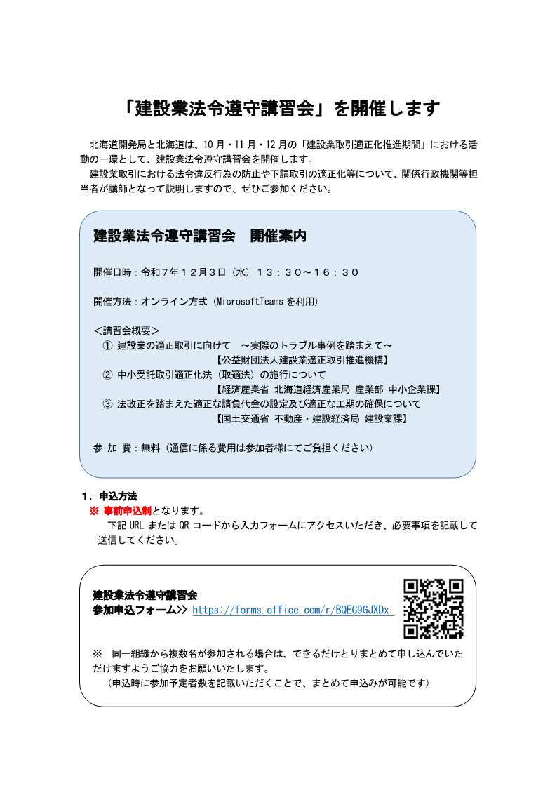 【建設業法令遵守講習会のご案内】📢 12月3日(水)オンライン開催💻 建設業の最新法令・取引情報をわかりやすく解説😃 どなたでも参加OK‼️ #建設業 #法令遵守 #オンライン講習会 🔽申込はこちらから🔽 forms.office.com/r/BQEC9GJXDx pic.x.com/srchRdwjbS