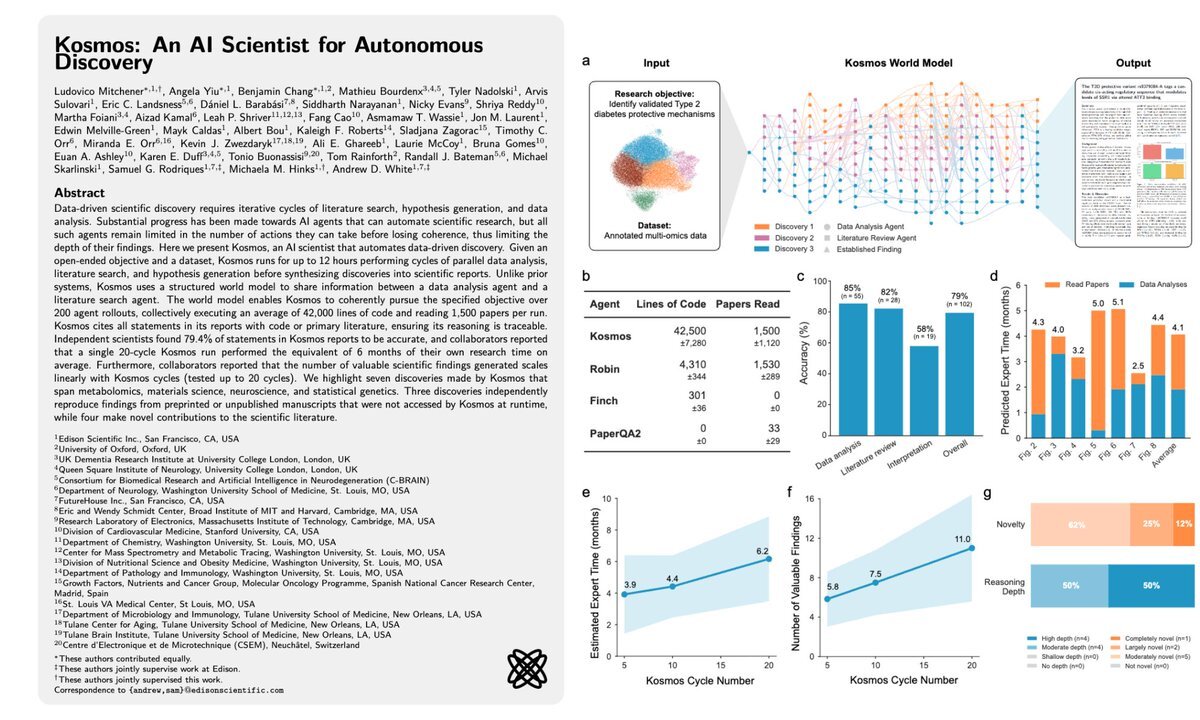 ついに科学者の仕事がAIに奪われる時代が到来しました。 Microsoftが、自律的に新発見を行う世界初の「AI科学者」Kosmosを発表。 これは単なるデータ分析AIではなく、仮説生成から実験、自己改善まで行い、新たな知識を創造します。 その衝撃的な詳細を9のポイントにまとめました。 1.