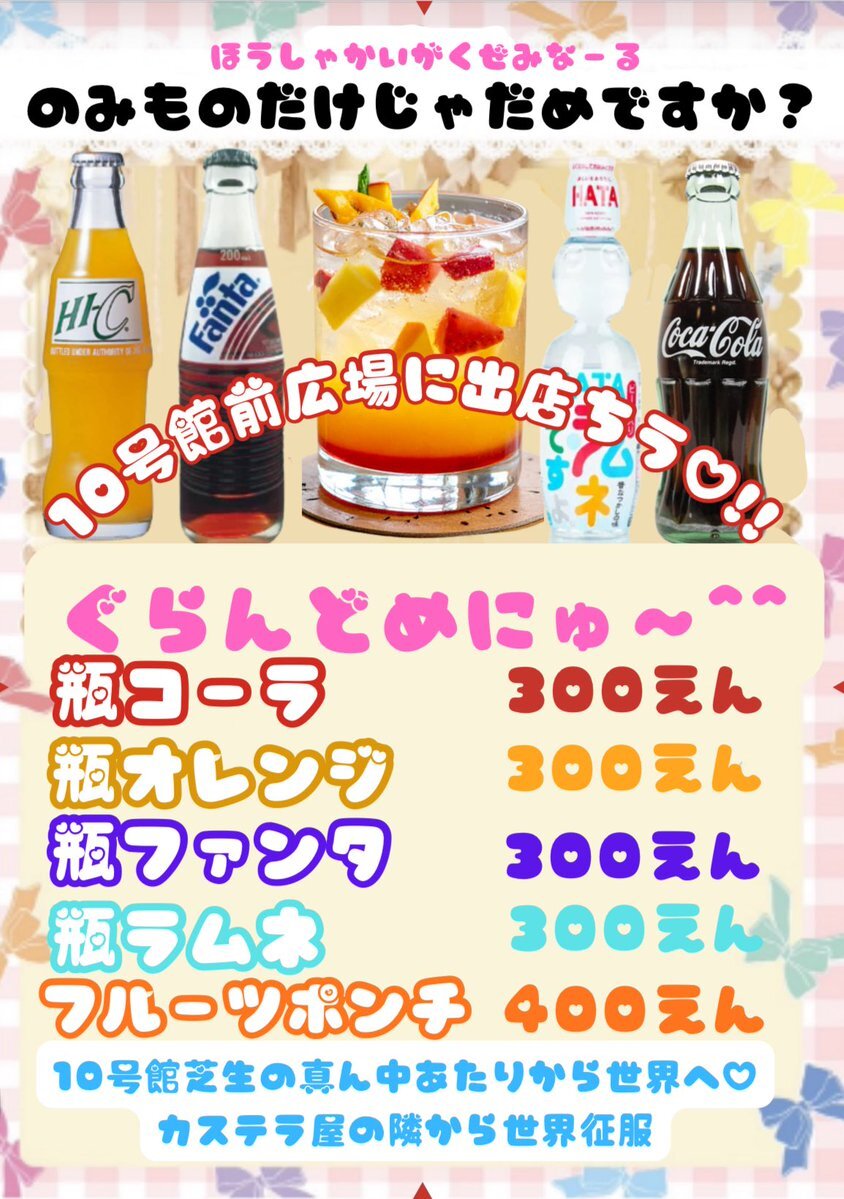 法社会ゼミナール4年生は3年生のお隣でドリンク・フルーツポンチ販売を行います🍹^_^ サイコロ振って3つゾロ目でたら無料になるかも…❓ ぜひ、喉を湿しにお越しください! 可愛いうちわが目印です😉 #専修大学 #鳳祭 #ゼミ #法社会学 pic.x.com/xl8q5OGRPd