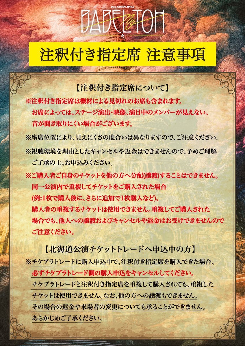 返信先:@AORINGOHUZIN🍏🦅#MrsGREENAPPLE 🦅#BABELnoTOH 【チケット情報🎫】福岡 《#みずほPayPayドーム》 福岡公演 ステージレイアウトの決定に伴い #注釈付き指定席 の販売が決定‼️📣必ず注意事項⚠️をご確認いただき納得してからご購入してね⚠️ ⏰🎫販売開始日時 25年11/5(水)20:00〜 ※予定枚数に達し次第販売終了⚠️