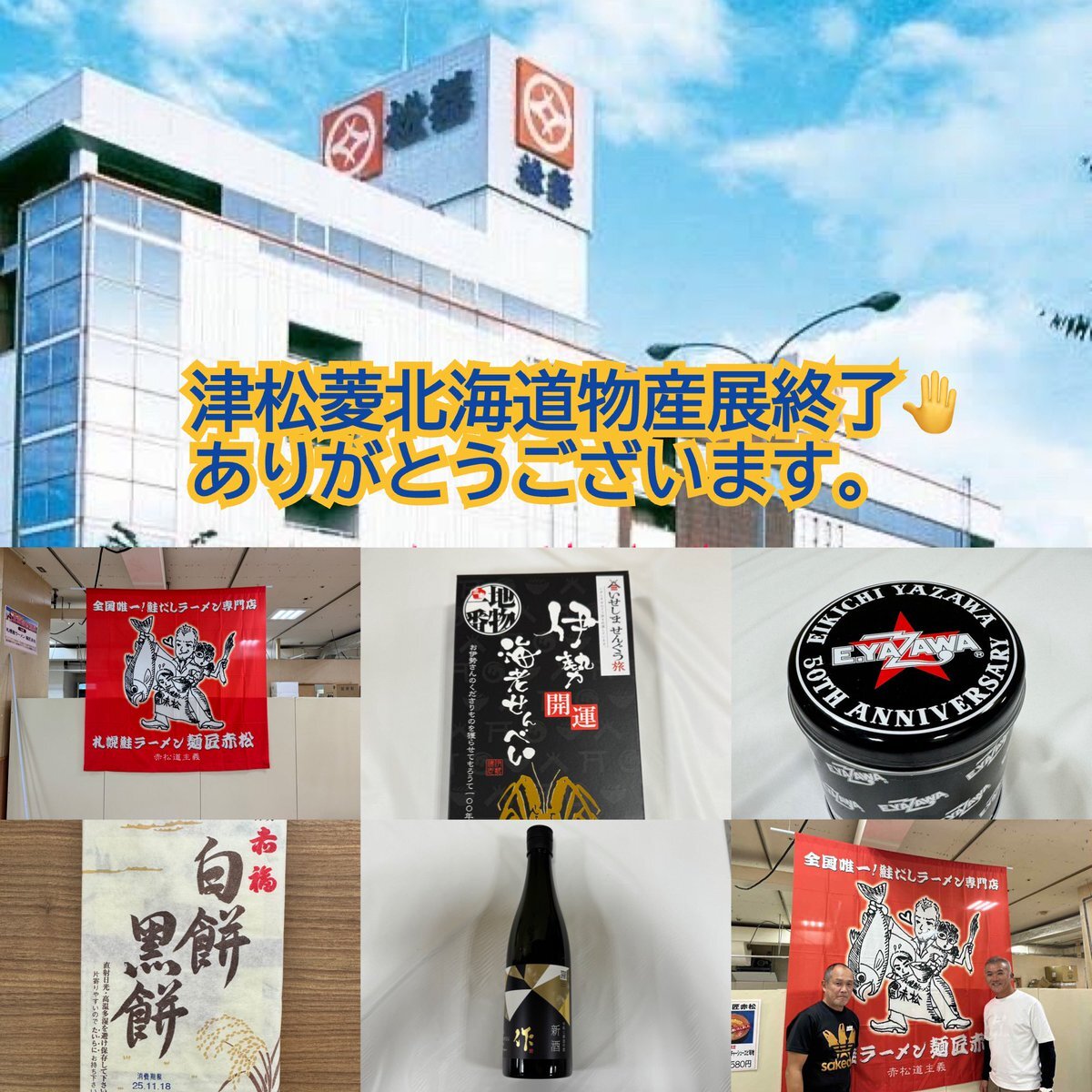 🍜 #札幌鮭ラーメン麺匠赤松・赤松デス #津松菱北海道物産展 【3日目】 昨日会場イートインスタッフNサンに 『赤松サン #善人顔 してますね!!』 俺の人生で…初めて言われたじゃん😄 そんな事で3日目スタート 限定ラーメン 大人気で昼前に売り切れる😰 お早めのご来場お待ちしております。 pic.x.com/HPtA96tRkZ