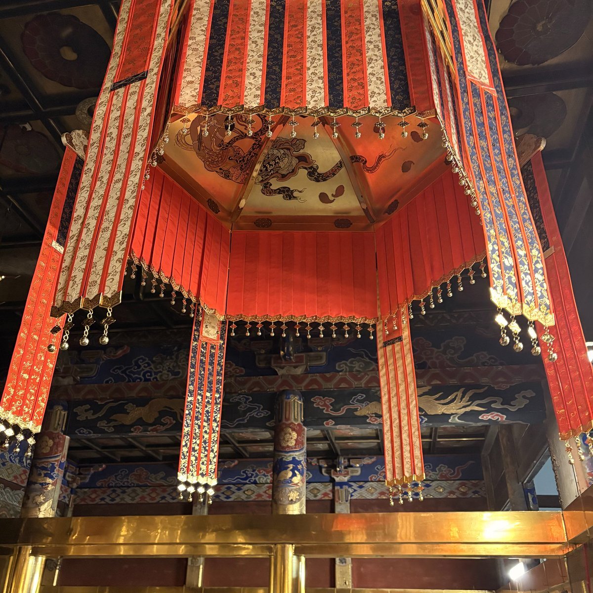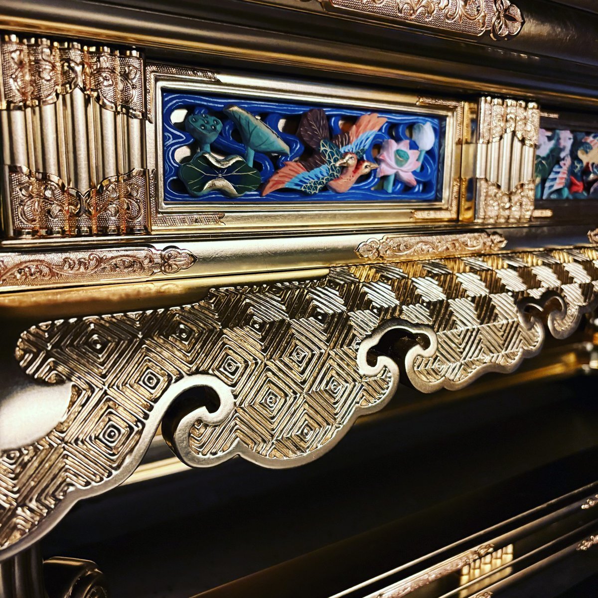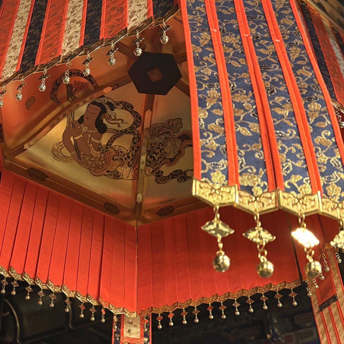 先日、祖師・御代前前卓を納めさせていただきました #富山県#浄土真宗本願寺派 のお寺様に、 #阿弥陀堂型#金襴幡蓮型人天蓋 も併せて納品させていただきました。今回は人天蓋本体はそのままで #金襴幡#金具 を新調しました。無事納品することができ、大変喜んでいただきました。 合掌 pic.x.com/fJqdFclvdW