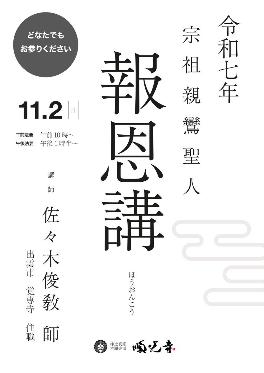 11月2日(日)、順光寺「宗祖親鸞聖人 報恩講」をお勤めいたします。 「報恩講(ほうおんこう)」は、 浄土真宗の教えをお遺しいただいた宗祖親鸞聖人のご遺徳を偲び、お聴聞をさせていただく法要です。 お誘い合わせのうえ、ご参拝ください。 #浄土真宗 #浄土真宗本願寺派 #西本願寺 #報恩講 pic.x.com/9hyPk8c0RO