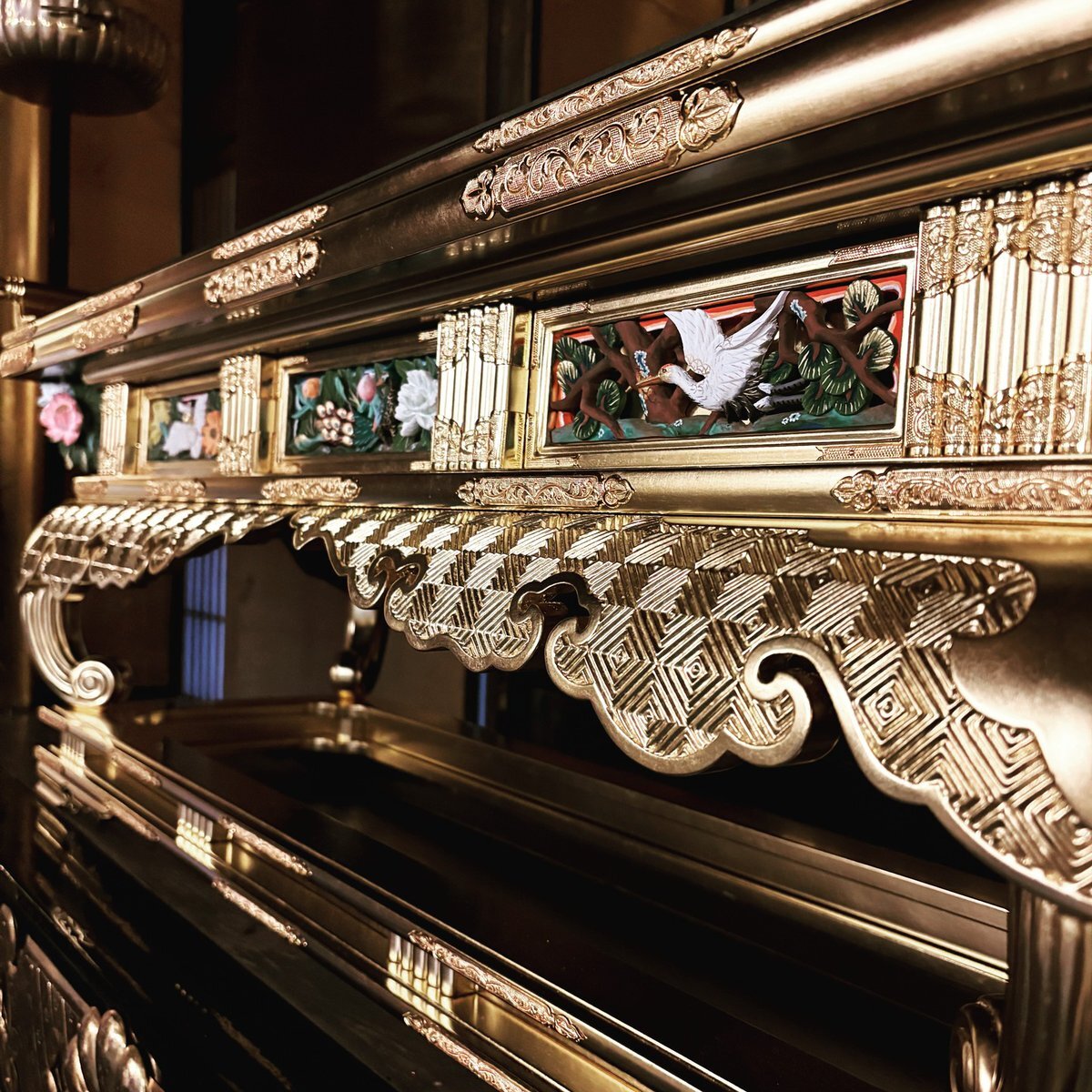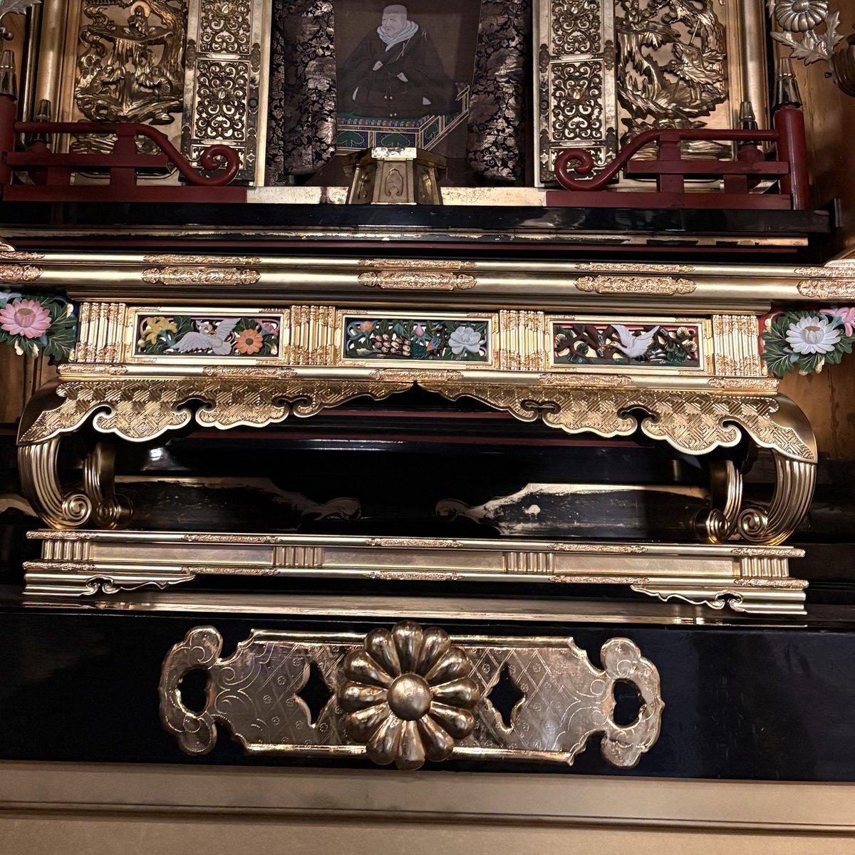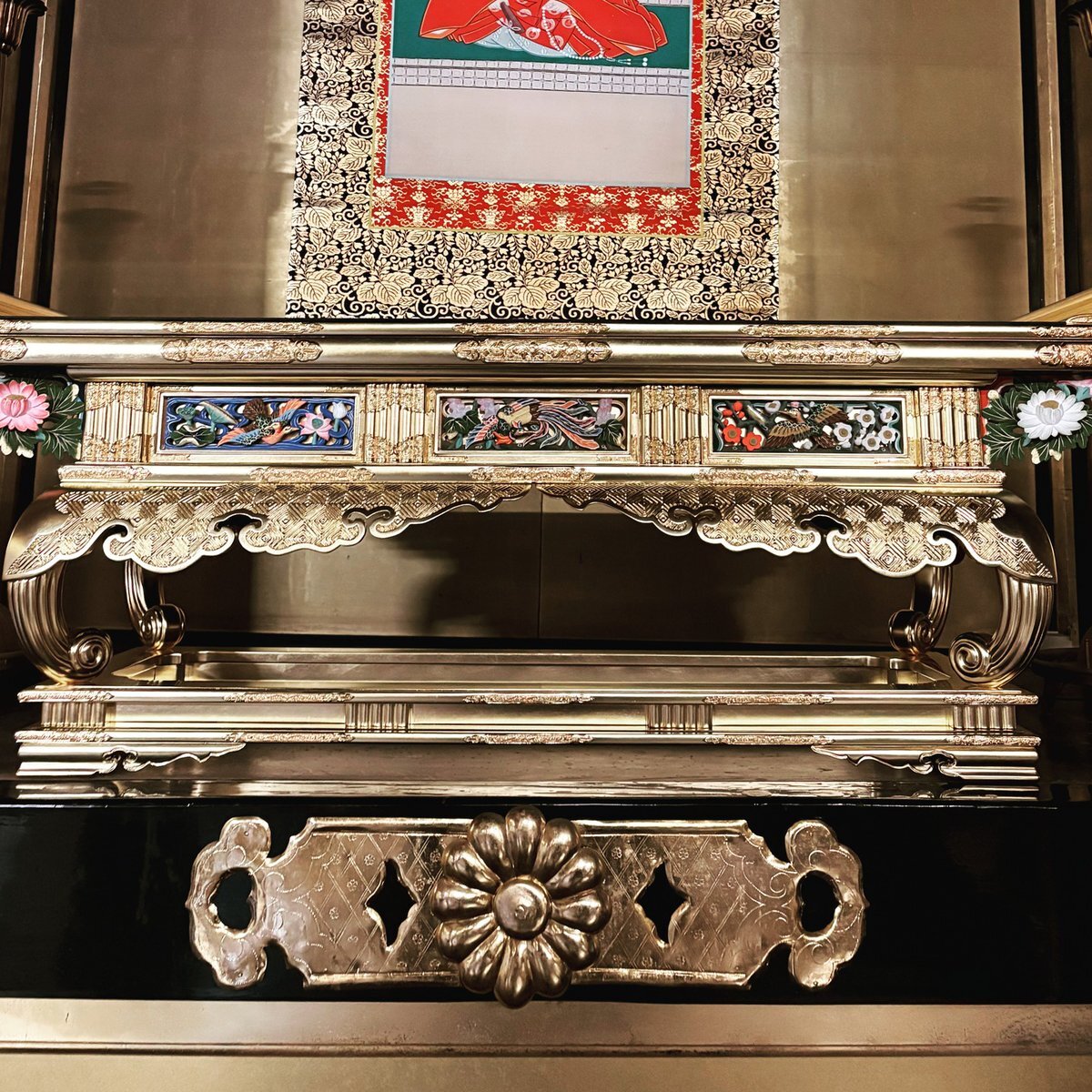 #富山県 #氷見市 にあります #浄土真宗本願寺派 のお寺様に #祖師前#御代前前卓 を納めさせていただきました。横幅3.5尺の仕様は #腰三鳥彫#純金箔仕上げ#彫刻極彩色 仕上げ となっております。 合掌 pic.x.com/nFuqoojTZM