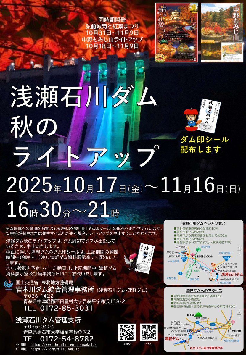 【#イベント情報】#浅瀬石川ダム で10月17日(金)より秋の #ライトアップ を実施します! 毎回好評のダム印シールの配布や、青の煌めきあおもり国スポを盛り上げる動画の投影も行います。 なお、#津軽ダム ではクマ出没の影響により中止いたします。 #水しごと #黒石市