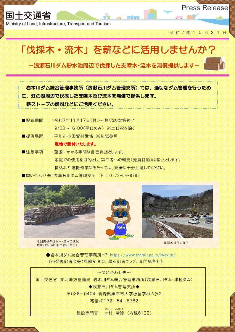 【お知らせ】 #浅瀬石川ダム では、虹の湖周辺で伐採した支障木や流木を無償提供します。 ご不明な点は浅瀬石川ダム管理支所(電話0172-54-8782)へお問い合わせください。 #水しごと pic.x.com/kYxBk4K5VU
