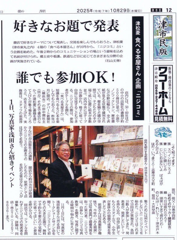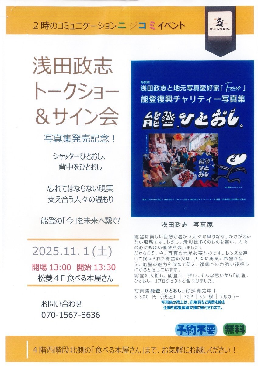 !急遽開催! 「浅田家」について語ろう! (浅田 政志さん来場は11月1日です。) 日時:10月30日、31日 時間:14:00分〜 場所:松菱百貨店4階「食べる本屋」 #津市 #松菱 #浅田家 #Tsucity #Matsubishi #TheAsadas pic.x.com/fFVUptRbxj