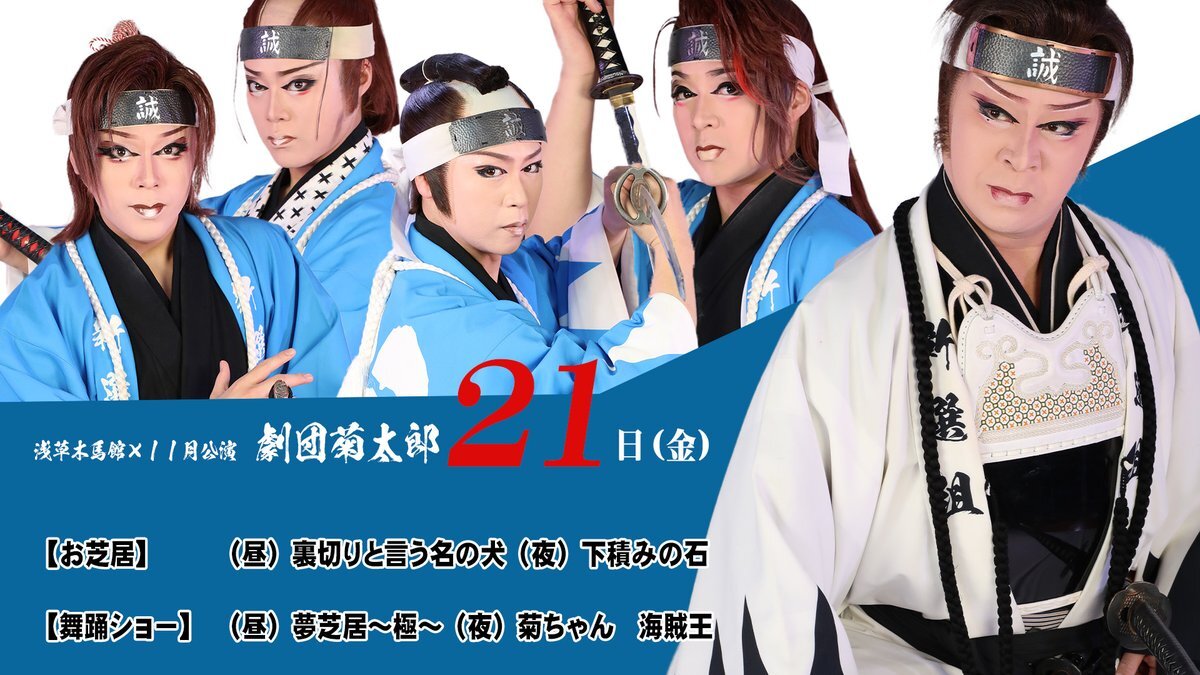 --浅草木馬館 #劇団菊太郎 11月公演-- 📅11月21日 【昼】11時00分開場 12時00分開演 【夜】16時45分開場 17時30分開演 【お芝居】 (昼)裏切りと言う名の犬 (夜)下積みの石 【舞踊】 (昼)夢芝居~極~ (夜)菊ちゃん 海賊王 #劇団菊太郎