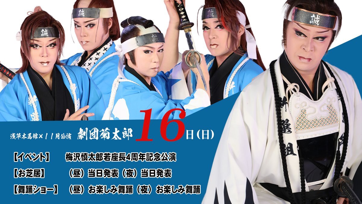 --浅草木馬館 #劇団菊太郎 11月公演-- 📅11月6日 【昼】11時00分開場 12時00分開演 【夜】16時45分開場 17時30分開演 【イベント】 梅沢慎太郎若座長4周年記念公演 【お芝居】 (昼)当日発表 (夜)当日発表 【舞踊】 (昼)お楽しみ舞踊ショー (夜)お楽しみ舞踊ショー