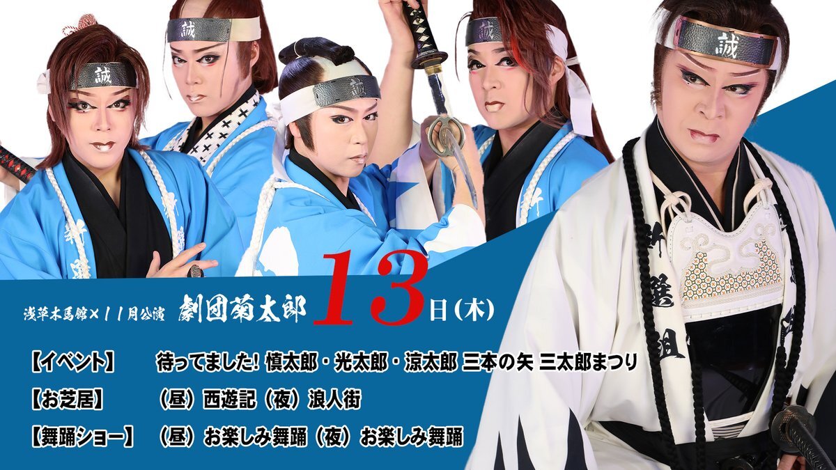 --浅草木馬館 #劇団菊太郎 11月公演-- 📅11月13日 【昼】11時00分開場 12時00分開演 【夜】16時45分開場 17時30分開演 【イベント】 待ってました!慎太郎・光太郎・涼太郎 三本の矢 三太郎まつり 【お芝居】 (昼)西遊記 (夜)浪人街 【舞踊】 (昼)お楽しみ舞踊ショー