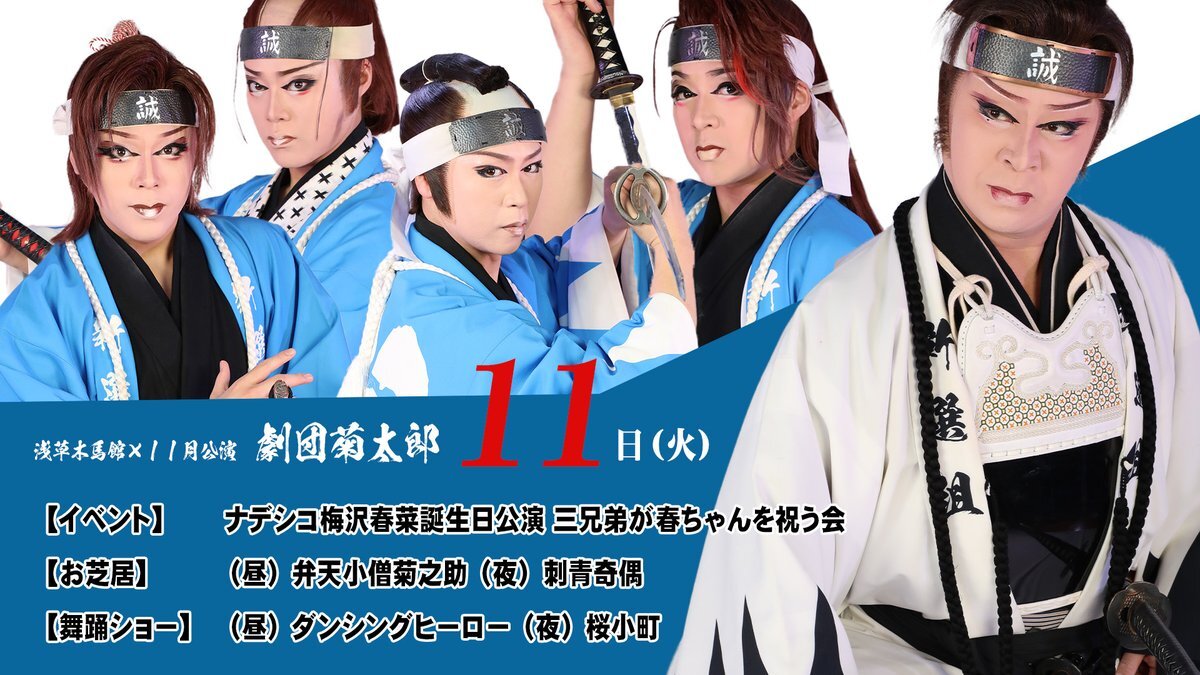 --浅草木馬館 #劇団菊太郎 11月公演-- 📅11月11日 【昼】11時00分開場 12時00分開演 【夜】16時45分開場 17時30分開演 【イベント】 ナデシコ梅沢春菜誕生日公演 三兄弟が春ちゃんを祝う会 【お芝居】 (昼)弁天小僧菊之助 (夜)刺青奇偶 【舞踊】 (昼)ダンシングヒーロー