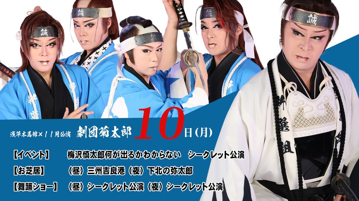 --浅草木馬館 #劇団菊太郎 11月公演-- 📅11月10日 【昼】11時00分開場 12時00分開演 【夜】16時45分開場 17時30分開演 【イベント】 梅沢慎太郎何が出るかわからない シークレット公演 【お芝居】 (昼)三州吉良港 (夜)下北の弥太郎 【舞踊】 (昼)お楽しみ舞踊ショー