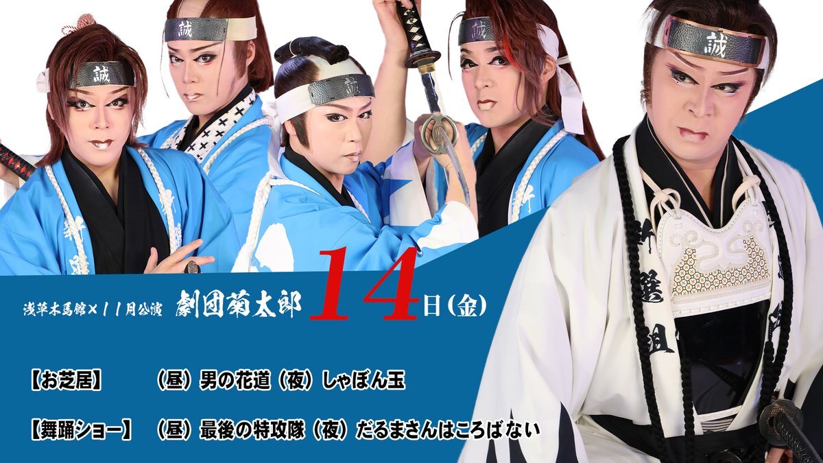 --浅草木馬館 #劇団菊太郎 11月公演-- 📅11月14日 【昼】11時00分開場 12時00分開演 【夜】16時45分開場 17時30分開演 【お芝居】 (昼)男の花道 (夜)しゃぼん玉 【舞踊】 (昼)最後の特攻隊 (夜)だるまさんはころばない #劇団菊太郎