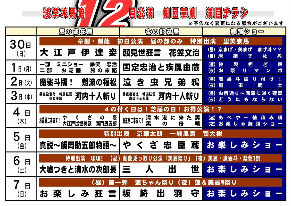 🔥劇団章劇 予約開始日&前半戦チラシ #劇団章劇 #浅草木馬館 12月公演チラシになります。 こちらを参考の上一度でも多くのご来場お待ちしております。 ※予告なく変更になる場合がございます。 【予約開始日】 11月17日(月)15:30分~予約順抽選 ⚠予約順の抽選を受ける方は pic.x.com/oT406Yvcub