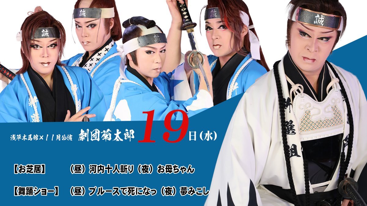 --浅草木馬館 #劇団菊太郎 11月公演-- 📅11月19日 【昼】11時00分開場 12時00分開演 【夜】16時45分開場 17時30分開演 【お芝居】 (昼)河内十人斬り (夜)お母ちゃん 【舞踊】 (昼)ブルースで死になっ (夜)夢みこし #劇団菊太郎