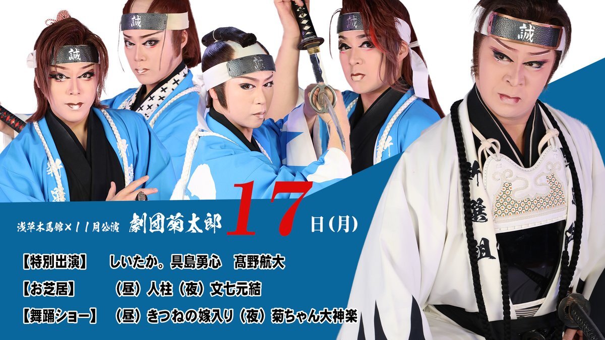 --浅草木馬館 #劇団菊太郎 11月公演-- 📅11月17日 【昼】11時00分開場 12時00分開演 【夜】16時45分開場 17時30分開演 【特別出演】 #しいたか。 #具島勇心 #髙野航大 【お芝居】 (昼)人柱 (夜)文七元結 【舞踊】 (昼)きつねの嫁入り (夜)菊ちゃん大神楽 #劇団菊太郎