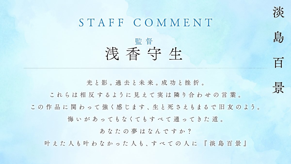 🔹スタッフコメント到着🔹 2026年放送TVアニメ「#淡島百景」 監督 #浅香守生 さんより スタッフコメントが到着。 『あなたの夢はなんですか? 叶えた人も叶わなかった人も、 すべての人に 『淡島百景』』 ▼是非ご覧ください▼ pic.x.com/E9POId6MNN