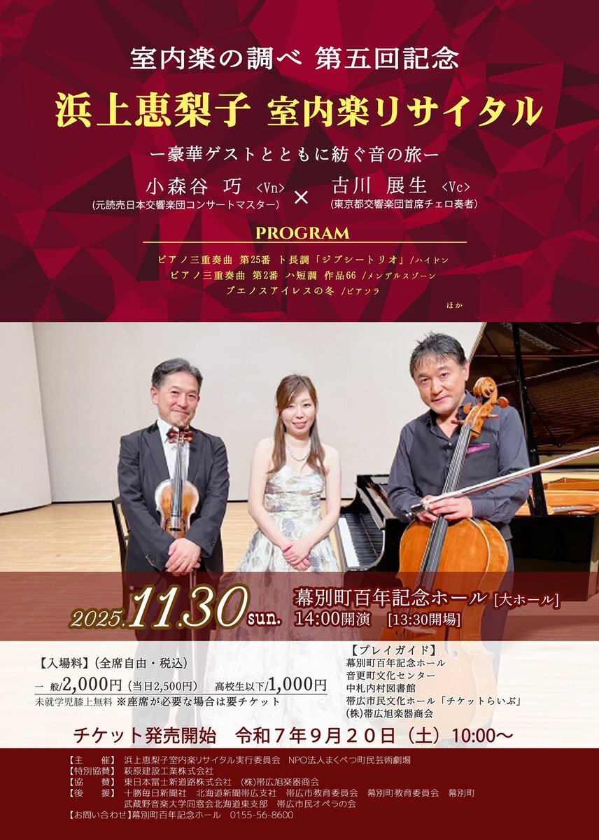 【室内楽の調べ 第五回記念】 #浜上恵梨子室内楽リサイタル 日時 令和7年11月30日(日) 14:00~ 場所 幕別町百年記念ホール 大ホール 料金 2,000円(一般・税込)    1,000円(高校生以下・税込)   *全席自由   *未就学児膝上無料(座席が必要な場合は要チケット) ⇒