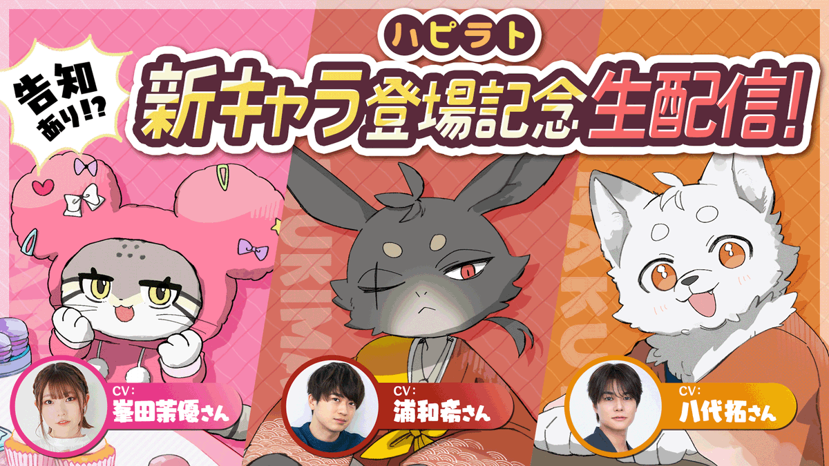 \#ハピラト 新キャラ登場記念生配信!🎉/ 🧡 月丸(CV: #浦和希 さん) 🤍 ハクタ(CV: #八代拓 さん) 🩷 マヌル(CV: #峯田茉優 さん) 生配信最後に、ミニ告知あり…⁉️ 📺 11/13(木) 20:00 配信開始 youtube.com/live/ZO0rXvWwF… ━━━━━━━━━━━━━━ #梶裕貴 #AItuber #AIチャット