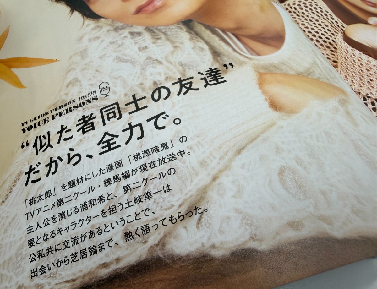 【「#TVガイドPERSON vol.159」11/11発売】いよいよ明日発売!声優連載にはTVアニメ「#桃源暗鬼」(@tougenanki_anm)に出演中の #浦和希 さん(@urakazuki_)×#土岐隼一 さん(@tokishunichi)が8Pで登場。プライベートでも仲良しだからこそ生まれる芝居論を語り合います。ご購入はamzn.asia/d/jcOfBy0 pic.x.com/rNjAXbLDNy