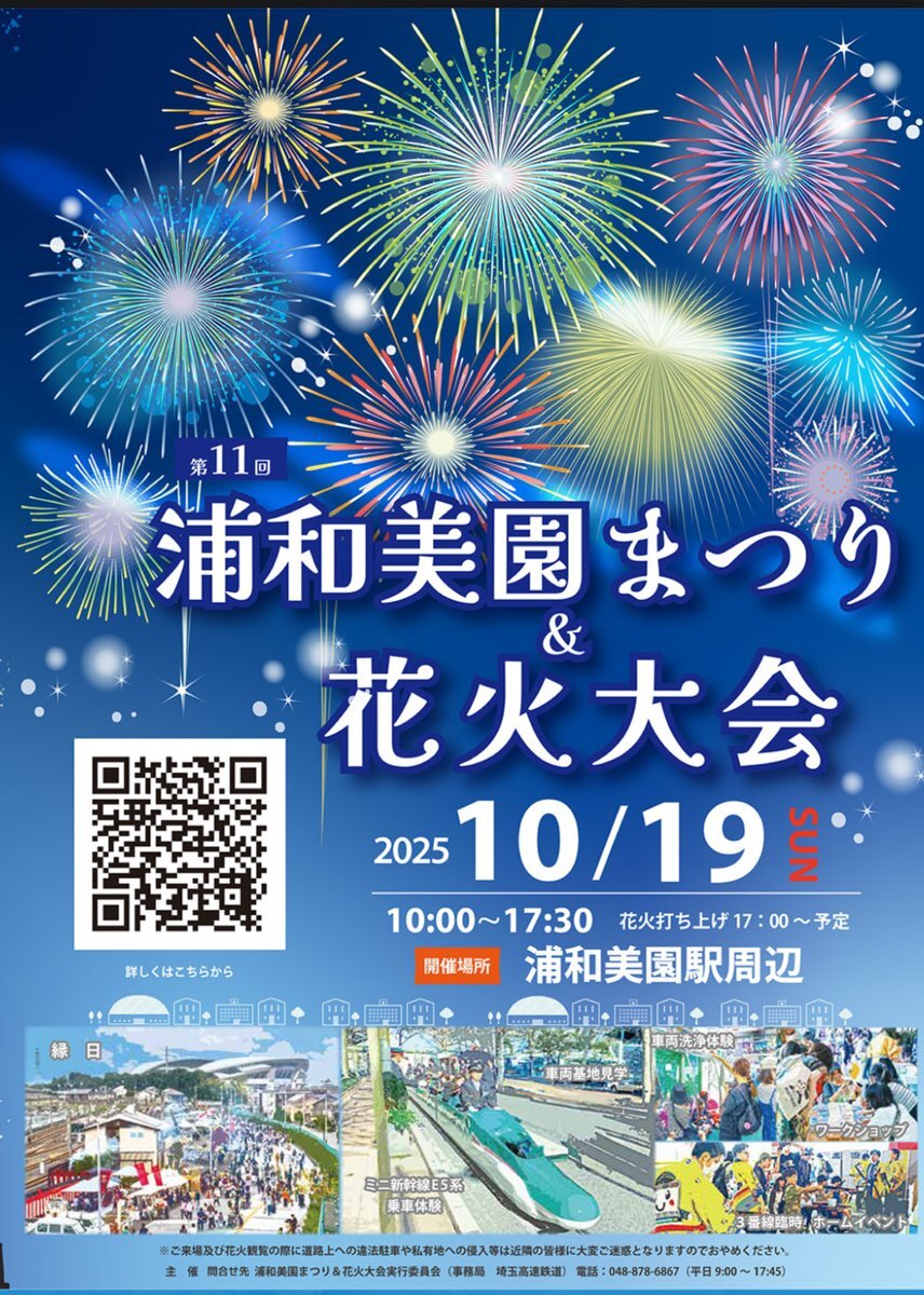 第11回 浦和美園まつり&花火大会が今年も開催予定です🎆 📅日程: 2025年10月19日(日) 📍会場:大門調整池 ⏰花火打上:17:00~17:30(予定) 秋空に広がる花火ショー、浦和美園の夜を彩ります❗️ #浦和美園 #花火大会 #浦和美園まつり pic.x.com/OAgNIJeccR