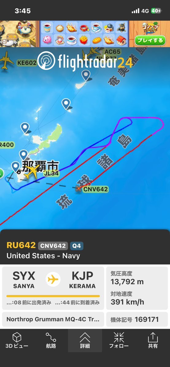 米海軍 洋上監視無人偵察機 ノースロップグラマン製 MQ-4Cトライトン ビューロナンバー:169171 HexMode:AE6257 嘉手納RWY23Lから離陸02:26JST 嘉手納RWY23Lに戻り着陸19:00JST #OHアラート