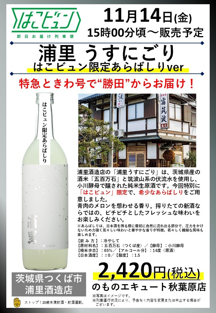 \「#はこビュン」でお届け/ 茨城県の人気酒蔵 #浦里酒造店 が醸す「浦里うすにごり」を、特急ときわで輸送します。 「はこビュン」限定で、希少なあらばしりをご用意しました。搾りたての新酒ならではの、フレッシュな味わいをお楽しみください🍶 11/14(金)15時より、のもの秋葉原店にて販売予定! pic.x.com/E2qDfY4Kha
