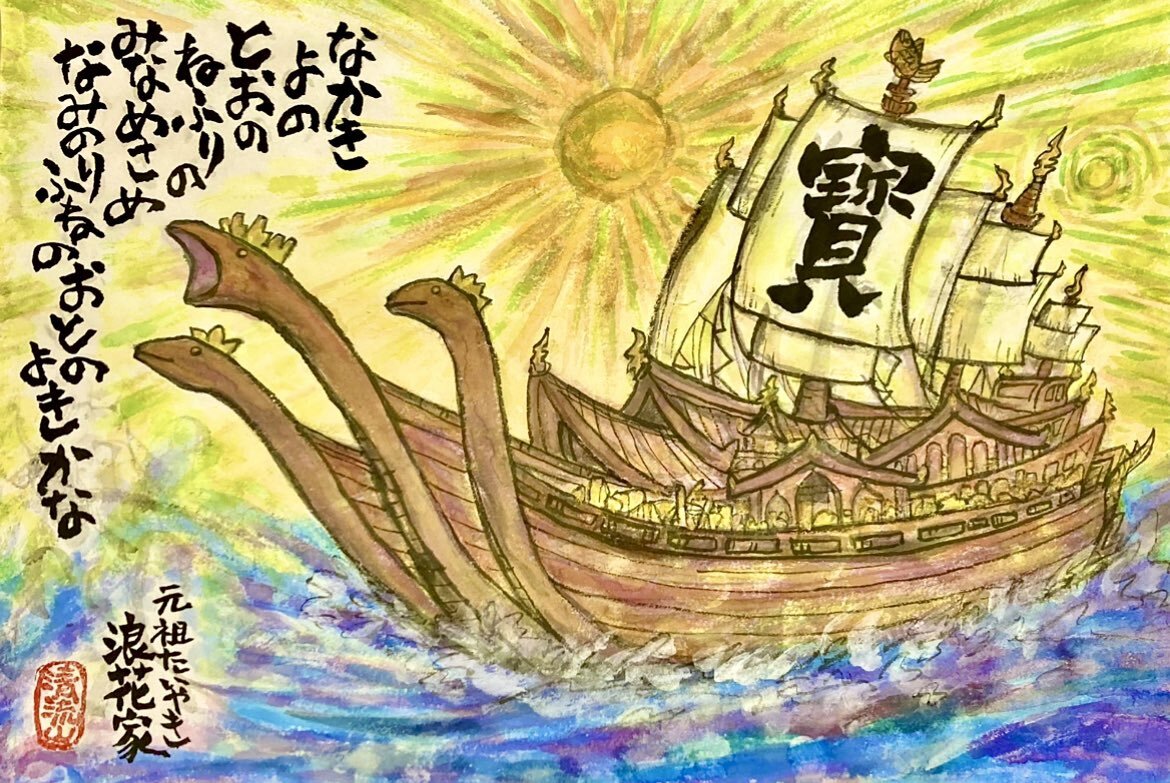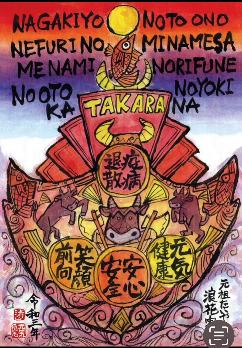 2021(令和三年) なんと抜けてましたー丑年🐮寶船⛵️の画 なかきよの とおのねふりの みなめさめ〜 コロナ感染が吹き荒れた時、なんとか元気を出していこうと描いた寳船の画でしたー*\(^o^)/* #浪花家総本店 #asakusananiwaya #kamakura_naniwa #大阪浪花家 #seizanSEIZAN1 pic.x.com/ANXFon3lwT