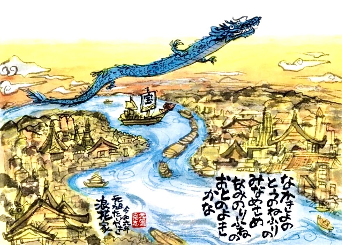 2023(令和五年) 辰年🐲寶船⛵️の画 なかきよの とおのねふりの みなめさめ〜‥ この画はご縁のある地、タイ🇹🇭バンコクをイメージした作品です🙂太陽国天使都(クルンテープ)の空に青龍が舞い上がります🐉✨ #浪花家総本店 #asakusananiwaya #kamakura_naniwa #大阪浪花家 #seizanSEIZAN1 pic.x.com/UVfx6jjkRc