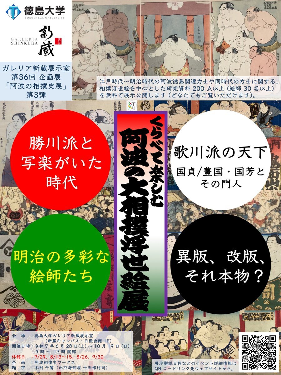 現在、ガレリア新蔵展示室で開催中の「くらべて楽しむ 阿波の大相撲浮世絵展」は、10月19日(日)までの開催となっております。展示室を埋め尽くす相撲浮世絵は圧巻です。ぜひお越しください。 tokushima-u.ac.jp/gs/docs/62784.… #徳島大学 #ガレリア #新蔵 #展示室 #企画展 #相撲 #浮世絵 pic.x.com/ZoDfM670GJ