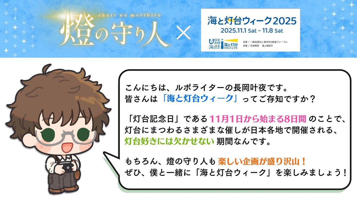 ✨🌊『海と灯台ウィーク』スタート🌊✨ 《#燈の守り人 ✖️ #海と灯台ウィーク2025》 今年も灯台ウィークの季節がやってきました✈️✨ 11月1日の「灯台記念日」から始まる8日間は 日本各地で灯台にまつわる催しが開催されます🌊 燈の守り人も3つの企画を用意しました💨 ❶ #灯台祭2025 pic.x.com/JbS0U5TmMa