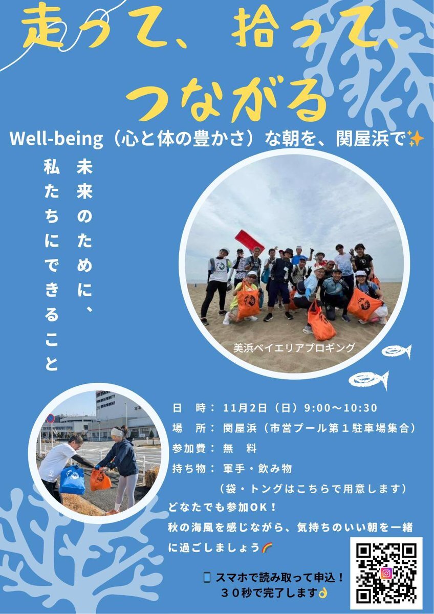 11月2日のポスター、申込先のQRコードを大きくしました☆ スマホで読み取り、わずか30秒で完了! お待ちしてます♩ #関屋浜 #プロギング #プロギングイベント #Wellbeing #クリーン活動 #ジョギング #朝活 #海のある暮らし #新潟イベント #地域つながり #エコライフ #SDGs #プロギングにいがた pic.x.com/di8tCR9LFk