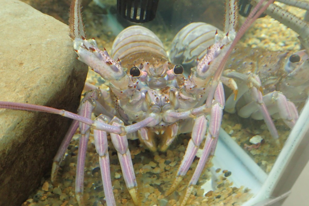 新聞、テレビ、ネットで話題の「白」と「青」のイセエビは現在も飼育展示中です。比較用のため、普通の「赤」のイセエビも展示しています。ぜひ間近でご覧ください!! #ちば海博 #イセエビ #勝浦 #今日の海博水槽