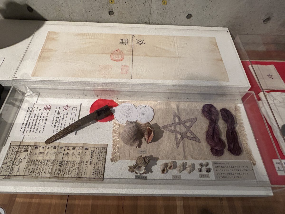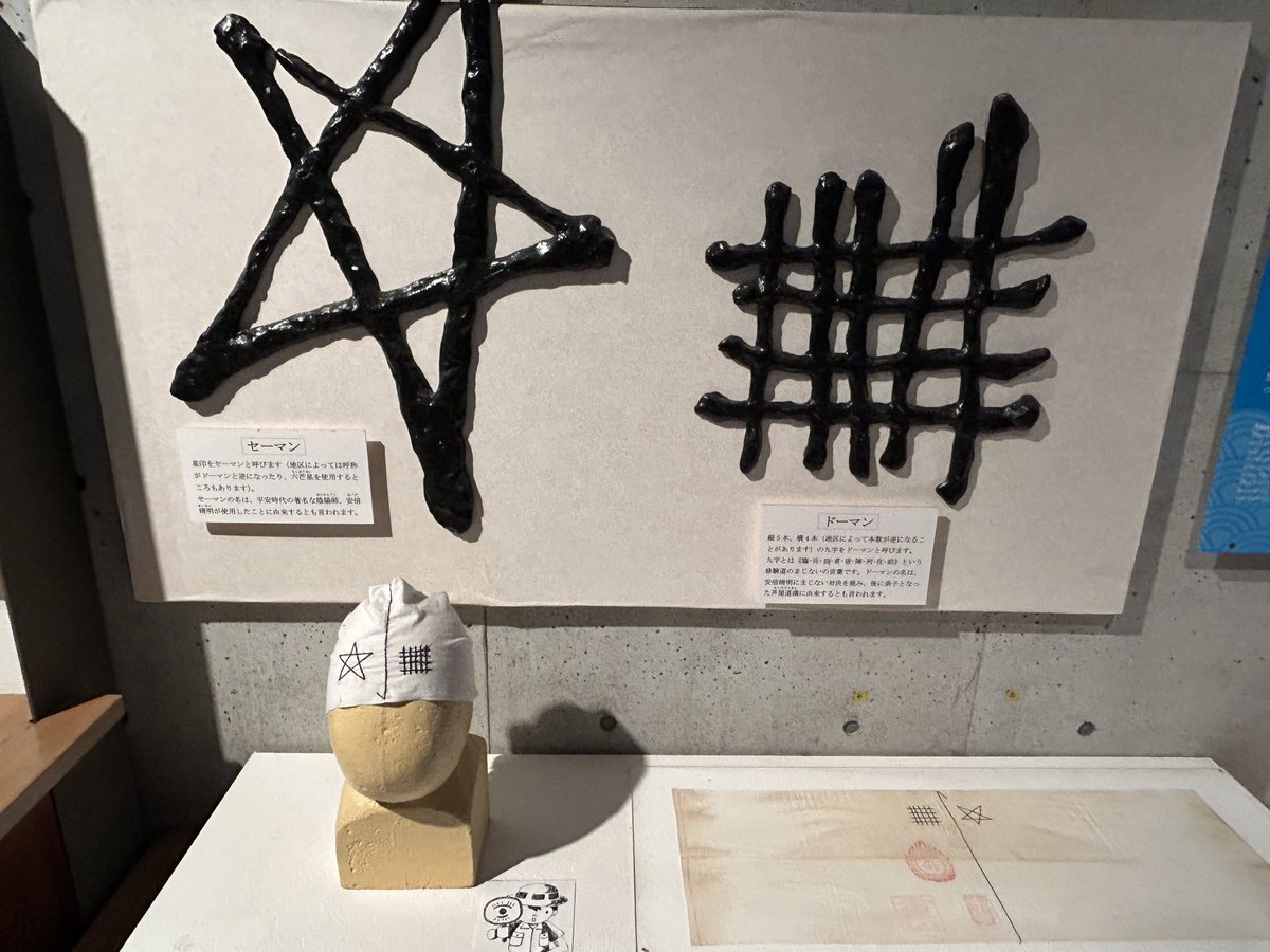 セーマンの星印は、一筆で書け、元の位置に戻ってくることから、潜っても必ず浮いて戻るといった縁起を信じ、ドーマンの格子模様は魔も迷って入ってこられないと信じられていました。これらを信じ、#海女 たちはこの印を身に着け海に潜っています。#海の博物館 #三重の文化観光シリーズ #三重県 pic.x.com/nsOpHtIWoE