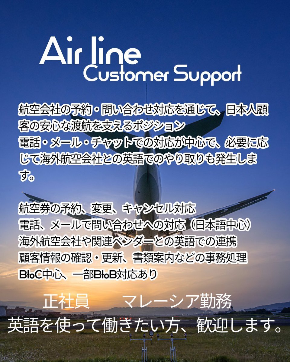 【航空業界×日本語CS】アラダマンサラ勤務/夜勤なし 日本人顧客対応+海外航空会社との英語連携!RM9,500+KPI最大RM400/英語研修6週間 航空業界に関わる実務経験を積むチャンス。BPOの正社員求人です。 #マレーシア求人 #海外転職 #航空業界 #カスタマーサポート #英語を使う仕事 pic.x.com/sCNP75atcc