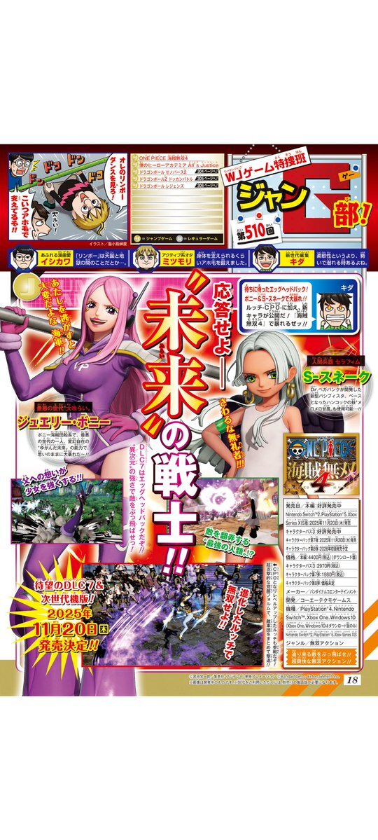 // 📢「ONE PIECE #海賊無双4」 DLC第7弾の参戦キャラクターを公開! \\ キャラクターパック第7弾は「未来島エッグヘッドパック」! 本DLCにて、ジュエリー・ボニー、 S-スネーク、ルッチ -CP0- の参戦が決定🔥 追加キャラクターの衣装計3着も収録したDLC第7弾は、11月20日(木)配信開始!