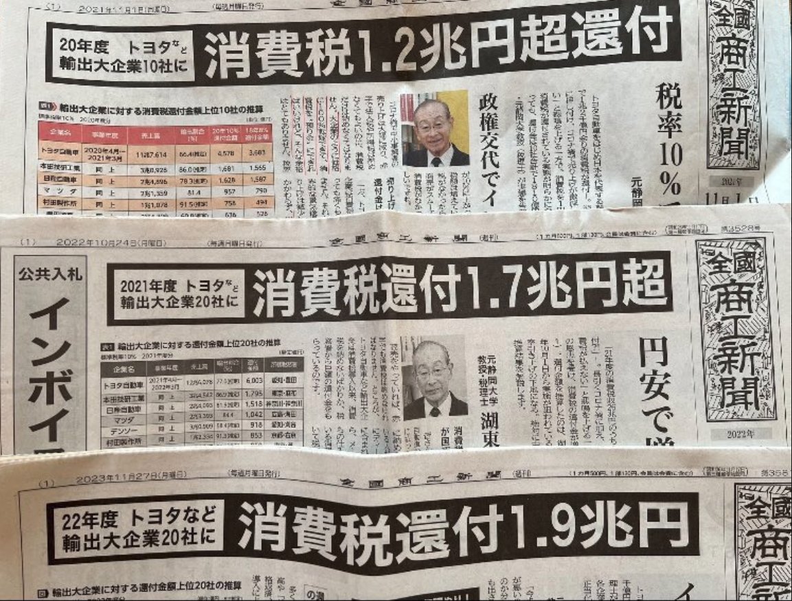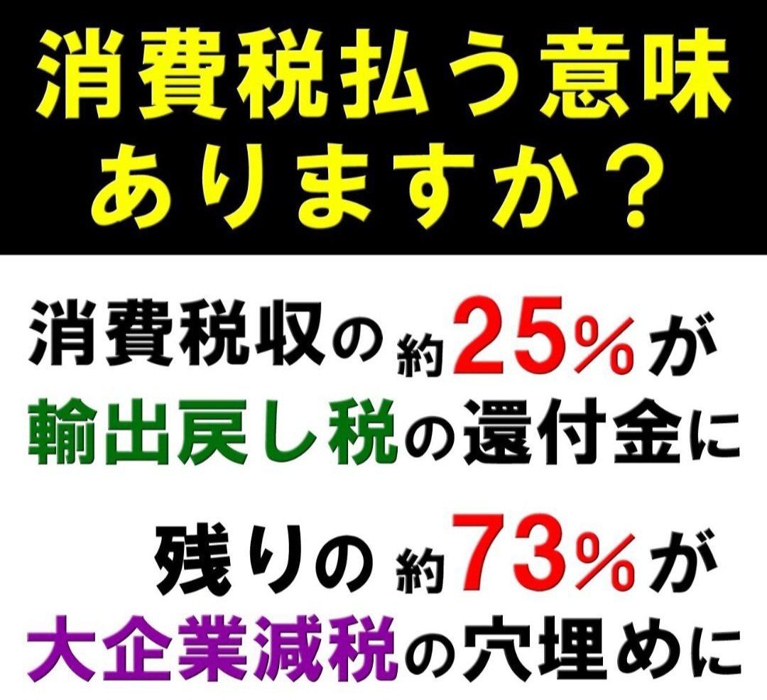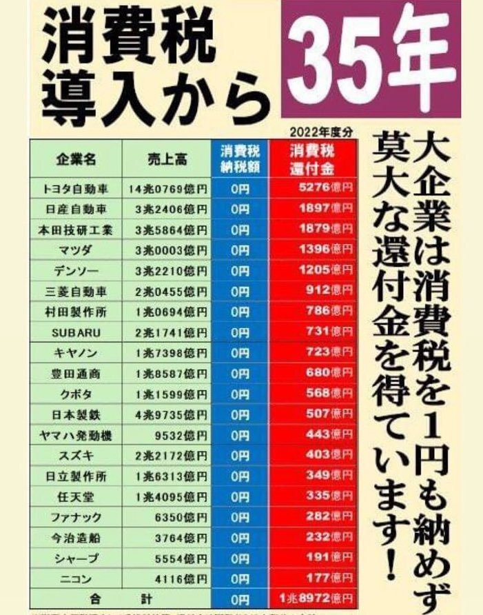 #史上最大の国家汚職 #消費税は特殊詐欺税 何事のタグと驚きますか? 消費税の導入当初からの目論見 ルノーを真似して輸出企業補助金 法人税まで下げ続けた 社会保障の安定財源なんだと トランプ氏に説明に行けば良い 理解が得られるか? 見物である @jimin_koho pic.x.com/ebVMQCWqp4